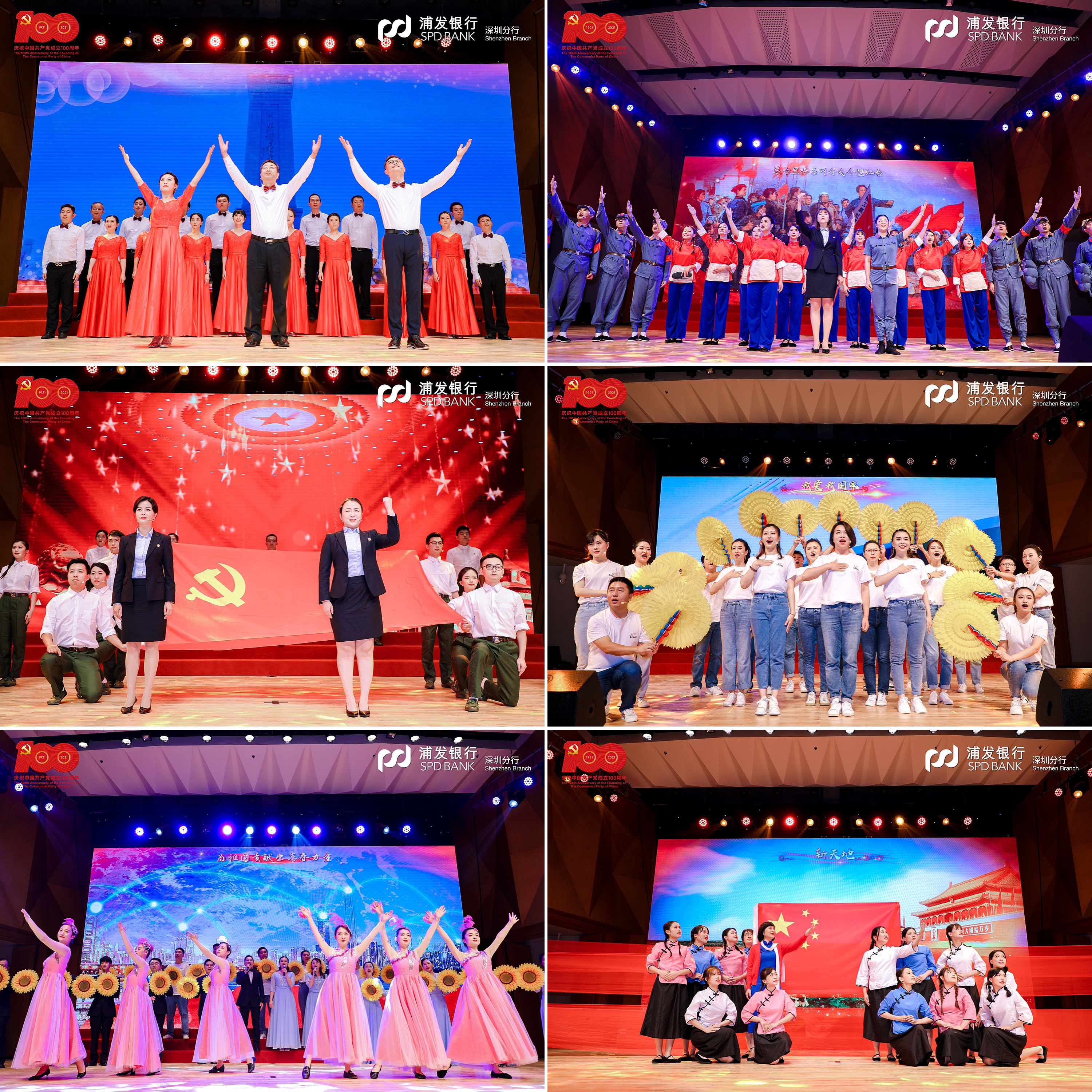 在黨支部風(fēng)采展示環(huán)節(jié),該行基層黨支部精心編排12首紅色經(jīng)典,通過4個篇章再現(xiàn)百年波瀾壯闊的偉大歷程。第一篇章“開天辟地”演繹了中國共產(chǎn)黨在新民民主義革命時期完成救國大業(yè)的輝煌歷程,《保衛(wèi)黃河》吹響了高亢嘹亮的愛國號角,《十送紅軍》深情演繹血濃于水軍民情,《繡紅旗》一腔熱血帶著大家重回歌樂山。第二篇章“改天換地”回顧了中國共產(chǎn)黨在社會主義革命和建設(shè)時期完成興國大業(yè)的奮斗史詩,《歌唱祖國》撥動人們最難忘的記憶,《我們走在大路上》展現(xiàn)當(dāng)年敢闖敢拼的奮進(jìn)之姿態(tài),《唱支山歌給黨聽》唱出人民心中永恒的贊歌。第三篇章“翻天覆地”再現(xiàn)了中國共產(chǎn)黨在改革開放和社會主義現(xiàn)代化建設(shè)新時期推進(jìn)富國大業(yè)的光榮壯舉,《在燦爛陽光下》重現(xiàn)春風(fēng)化雨之后的奮斗時光,《國家》打動多少人的赤子之心,《我們的生活充滿陽光》訴說了改革開放背后的喜悅。第四篇章“驚天動地”展現(xiàn)了中國共產(chǎn)黨在中國特色社會主義新時代推進(jìn)并將在本世紀(jì)中葉實(shí)現(xiàn)強(qiáng)國大業(yè)的偉大時代,一首《天耀中華》是浦發(fā)人最深沉的表達(dá),《燈火里的中國》讓人漫步燈火漫卷的萬里山河,《再一次出發(fā)》展示浦發(fā)追夢者的雄姿英發(fā)。走過“百年風(fēng)雨”,浦發(fā)銀行深圳分行合唱團(tuán)一首《我和我的祖國》,蓬勃朝氣盡顯拳拳愛國心、濃濃赤子情。篇章結(jié)束,大家全體起立,高聲合唱《沒有共產(chǎn)黨就沒有新中國》,以最真摯最熱烈的歌聲獻(xiàn)禮建黨百年。