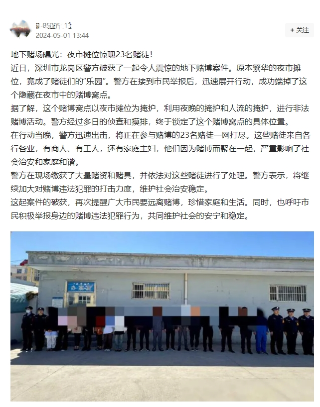 有網(wǎng)民在某社交平臺發(fā)帖稱:“近日,深圳市龍崗區(qū)破獲了一起令人震驚的地下賭博案件。原本繁華的夜市攤位,竟成了賭徒們的‘樂園’。”龍崗區(qū)相關(guān)部門第一時間對該內(nèi)容進行核查,確認此消息不實,龍崗區(qū)沒有發(fā)生此類案件。