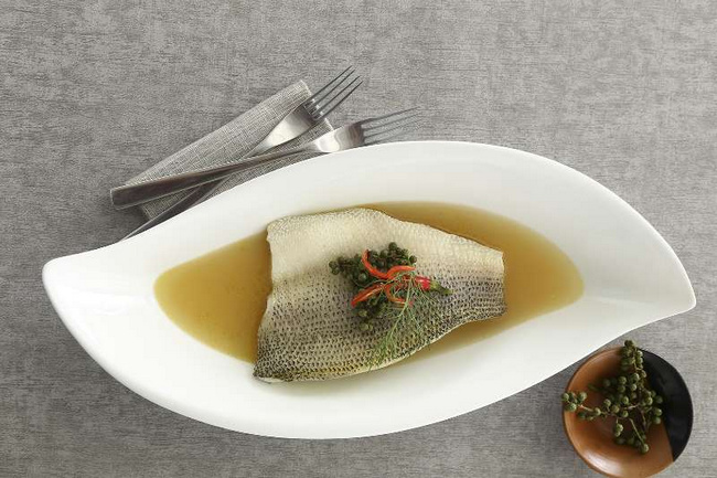 區(qū)別于充斥著辣椒與熱油的傳統(tǒng)水煮魚,梧桐 PLUS 的 fusion水煮魚外表清新,口感麻辣。食材選用三斤左右的上等淡水鱸魚,清晨宰殺,剔骨后整場(chǎng)取肉,再經(jīng)過高溫蒸制,保證魚肉肉質(zhì)嫩滑松軟。并不像傳統(tǒng)的水煮魚采用的“湯菜”的方式,fusion水煮魚采用肉料分離的烹飪方式。魚湯經(jīng)過麻椒、辣椒的熬煮而變得味道濃郁,過濾后僅留清爽的湯汁,單從視覺上根本無法判斷蘊(yùn)藏的奇妙味道,這也正是這道招牌菜的精妙之處。盛盤后的fusion 水煮魚猶如一道藝術(shù)品,造型簡(jiǎn)約充滿意境,清亮的魚湯入口瞬間酸辣感通透口腔,脫離了紅油浸泡的濃郁麻辣口感,更加健康養(yǎng)生。