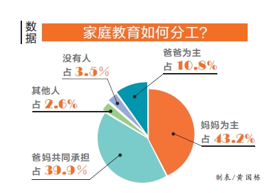 此次調(diào)查中,用14個(gè)指標(biāo)考察家庭教育分工情況,包括:輔導(dǎo)孩子學(xué)習(xí)、培養(yǎng)孩子特長、接送孩子上下學(xué)、開家長會、培養(yǎng)孩子日常行為習(xí)慣、糾正孩子的不良行為、教孩子明辨是非、照顧孩子的飲食起居、和孩子一起游戲及和孩子聊天。統(tǒng)計(jì)數(shù)據(jù)顯示,家庭教育分工中,“媽媽為主”的家庭占43.2%,“爸爸為主”占10.8%,“爸媽共同承擔(dān)”占39.9%,“其他人做”占2.6%,“沒有人做”占3.5%。
