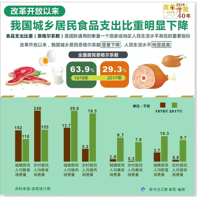 ② 國家統(tǒng)計局?jǐn)?shù)據(jù)顯示,改革開放以來,我國城鄉(xiāng)居民食品支出比重明顯下降。