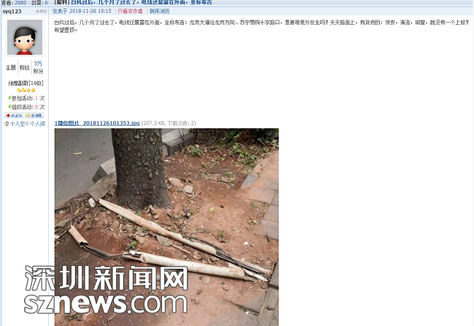 網(wǎng)友“syq123”發(fā)帖:臺風(fēng)過后,幾個(gè)月了過去了,電線還暴露在外面,坐標(biāo)布吉