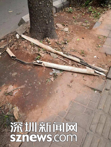 據(jù)網(wǎng)友“syq123”在論壇帖子上發(fā)帖稱,在地鐵3號線大芬站A2出口北行、中翠路與龍崗大道交口東南側(cè)人行道綠化帶上,埋在地下的線管破裂,電線裸露在外,十分危險(xiǎn)。同時(shí)提到電線旁邊倒下的大樹已經(jīng)扶正,但是電線依舊沒有進(jìn)行修理。