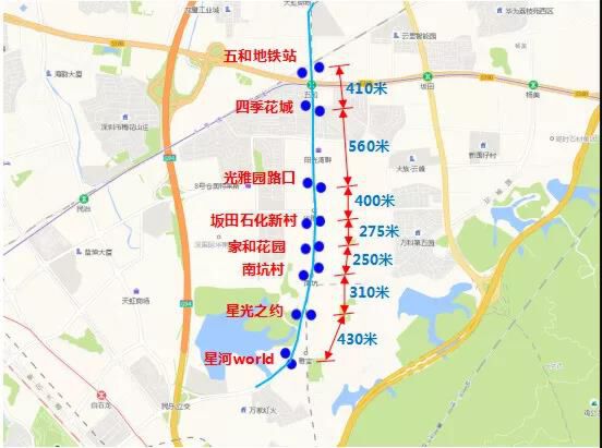 據(jù)介紹,五和大道是龍崗區(qū)坂田聯(lián)系市區(qū)的一條重要通道,道路交通流量及公交出行需求大,由于地鐵10號(hào)線施工導(dǎo)致道路條件受限,沿線五和地鐵站、四季花城、光雅園路口、南坑村和星河world等公交站大巴列車化問(wèn)題突出,使得市民公交出行時(shí)間較長(zhǎng),同時(shí)也加劇了道路擁堵。而上述站點(diǎn)之間,鄰近兩個(gè)公交站的最大間隔為560米,最小間隔只有250米。