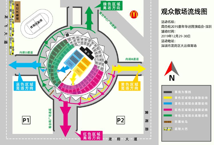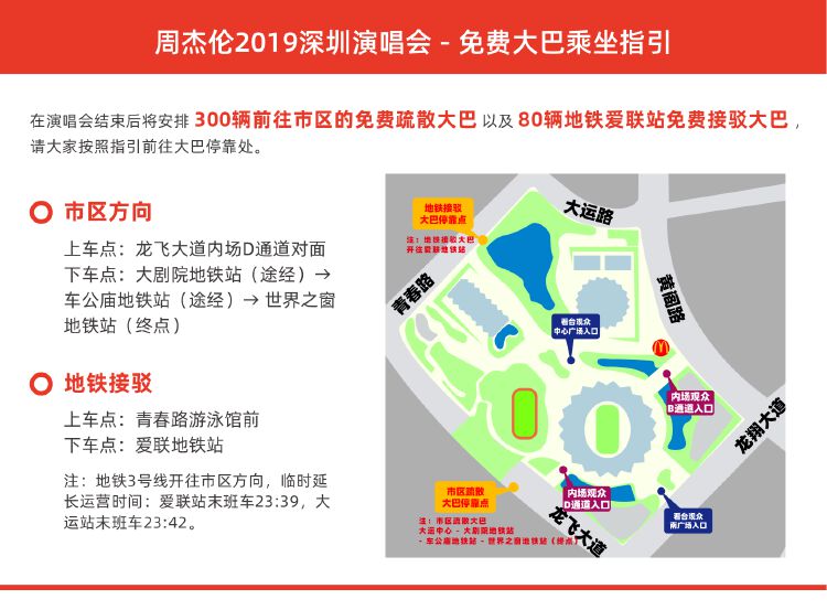 由于大運(yùn)地鐵站近期正值維修狀態(tài),出入站不便,建議市民演唱會結(jié)束后選擇愛聯(lián)站乘坐地鐵,地鐵3號線將臨時(shí)延長收車時(shí)間,其中愛聯(lián)站末班車23:39,大運(yùn)站末班車23:42。同時(shí)承辦方每天安排380輛(300輛停放在龍飛大道、80輛停放在龍城晨光路)疏散大巴用于演唱會結(jié)束后疏散觀眾。演唱會結(jié)束后,一是請前往羅湖區(qū)大劇院、福田區(qū)車公廟、南山區(qū)世界之窗市民在龍飛大道依次等候,大巴客滿出發(fā)后不返回大運(yùn)中心;二是請前往地鐵3號線愛聯(lián)站市民在青春路依次等候,大巴客滿出發(fā)后不返回大運(yùn)中心,具體如下: