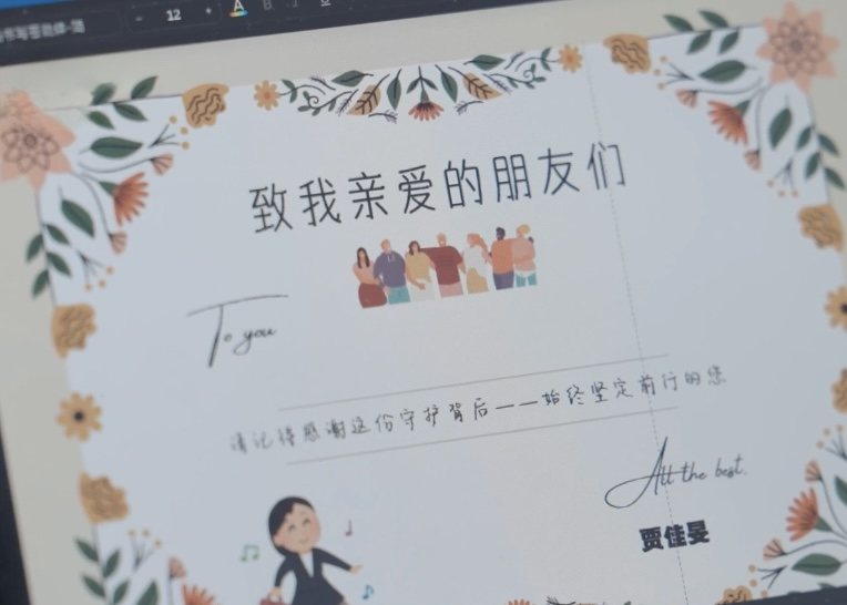 慢慢地,她養(yǎng)成了在交付新簽方案時,附上一封信的習(xí)慣。寫給孩子,替父母表達(dá)對他未來成長最深沉的愛與期許;寫給老人,感念他們?yōu)樽优饻嘏蹫?,如今愿以這份保障為盾,護(hù)他們晚年無疾憂、日常皆安;也寫給家庭的“頂梁柱”們,欽佩他們在城市打拼的堅(jiān)韌,也愿這份保障成為他們前行的底氣。在賈佳旻看來,每一份保障方案都承載著深沉的愛意和對未來的期許,每一張保單都帶著守護(hù)的溫度。
