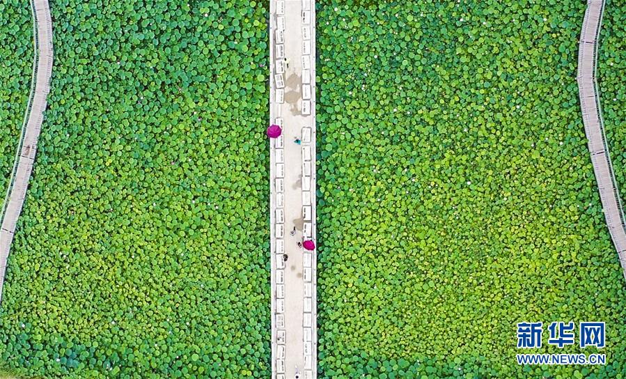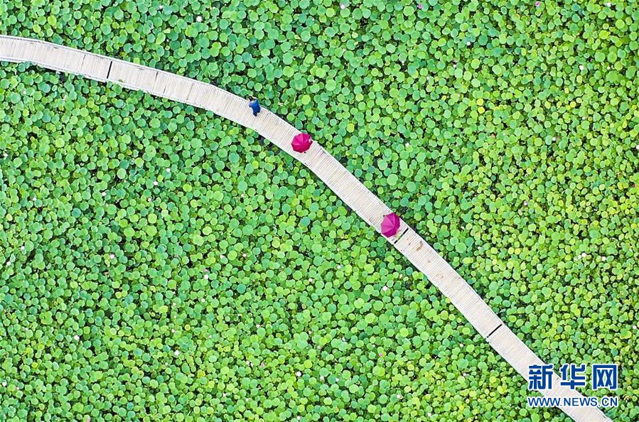 8月6日,游客在河北省永清縣里瀾城鎮(zhèn)金華湖觀賞荷花(無人機(jī)照片)。夏日時節(jié),河北省永清縣里瀾城鎮(zhèn)金華湖荷塘的荷花爭相開放,吸引市民和游客前來游玩觀賞。新華社記者李曉果攝