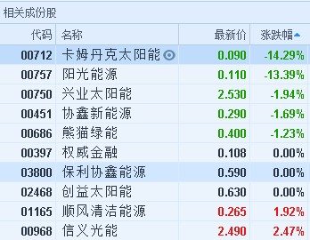 多只炒高的光伏股今日顯著回吐,截至11時53分,卡姆丹克太陽能(00712)跌14.29%,報價0.09港元,陽光能源(00757)跌13.39%,報0.11港元。