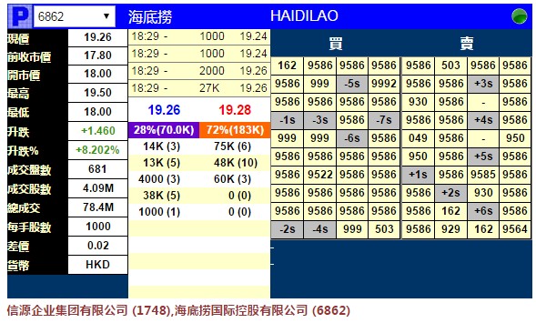 新股暗盤(pán) | 海底撈(03690)暗盤(pán)收?qǐng)?bào)19.26元漲8.2% 每手賺1460元