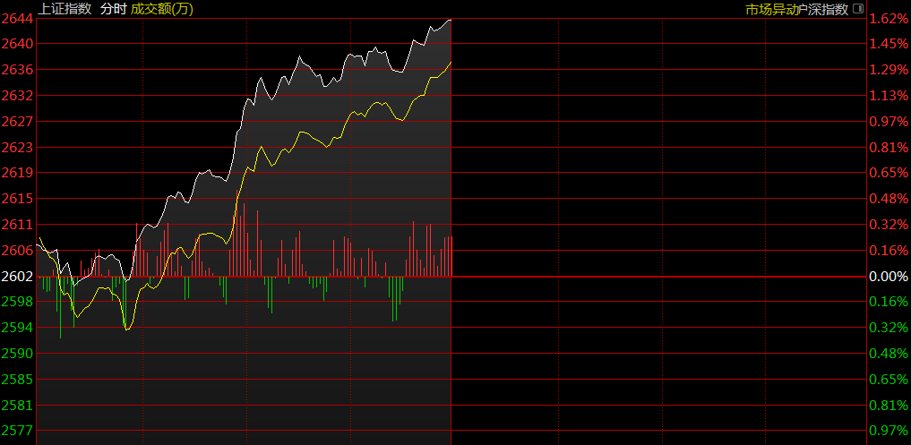 截至早盤收盤,上證指數(shù)報2643點,漲1.60%;深證成指報7844點,漲1.90%;創(chuàng)業(yè)板指數(shù)報1356點,漲1.35%。盤面上,板塊全面上漲,高鐵、水泥、家電、機場航運等板塊逆勢上漲。
