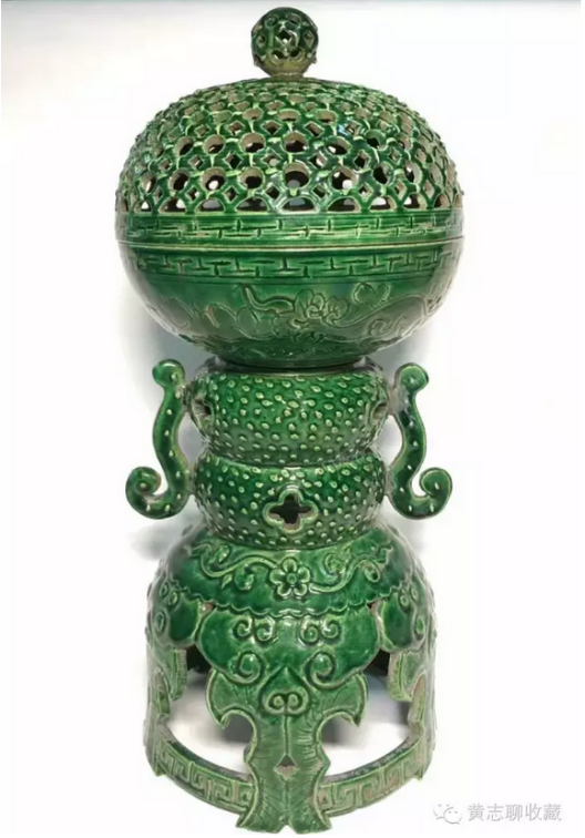 香薰高31.5cm、直徑14.5cm,整體呈豆式。豆是先秦禮器,用以在祭祀、宴饗中盛放肉食。在家廟祭祀中,豆是不可或缺的禮儀用具,早期豆用竹編成,后用青銅鑄造,因此在禮書中稱“籩豆”。此對(duì)香薰延續(xù)了青銅豆的大體形制,上作球形,香盤半圓,蓋為鏤空半圓,扣合后渾然如一。香盤可拆卸,安插于支座上。座上部為雙扁圓狀疊壓,兩側(cè)裝飾螭龍耳;下部呈鏤空裙擺式,承以托泥,穩(wěn)重大方。通體施綠釉,釉面潤澤,純凈自然。器身點(diǎn)綴穿花龍紋,如意紋,加之裙擺上的龕形開光,推測(cè)為當(dāng)時(shí)高等級(jí)的寺廟的佛前薰香供器。