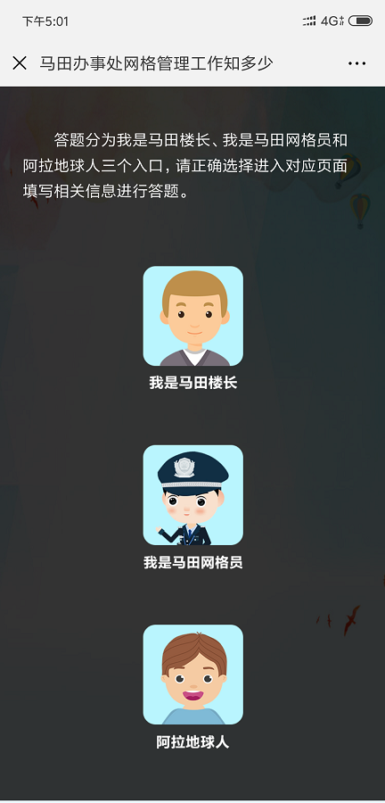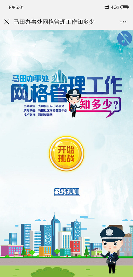 隨著當前光明新區(qū)經(jīng)濟和社會的飛速發(fā)展,網(wǎng)格巡查管理工作環(huán)境日趨復雜。為此,馬田辦事處以社區(qū)網(wǎng)格化為抓手,積極帶領(lǐng)業(yè)主、樓長、住戶主動參與到樓棟的管理和社區(qū)的建設(shè),使他們從小“家”邁向大“家”,家家參與、人人行動,讓安全文明新風形成常態(tài),營造生機勃勃、欣欣向榮的社會氛圍,在馬田轄區(qū)打造共建共治共享社會治理格局。“馬田辦事處網(wǎng)格管理工作知多少”線上有獎競答活動,由光明新區(qū)馬田辦事處主辦,馬田社區(qū)網(wǎng)格管理中心承辦。此次答題活動自8月15日9點啟動,截止至8月19日23點59分,為期5天。答題分為“我是網(wǎng)格員”入口、“我是樓長”入口和“阿拉地球人”三個入口。通過樓長入口進入的用戶,需輸入馬田轄區(qū)樓長身份證或港澳通行證號方可答題,網(wǎng)格員入口則需輸入馬田轄區(qū)網(wǎng)格員有效證件號碼進入對應的答題頁面。在每次答題時,答題系統(tǒng)將隨機抽取10道題,用戶須在120秒的時間內(nèi)完成,答對8題以上即視為闖關(guān)成功,可獲得一次抽獎機會,有機會獲得100元、50元、10元、5元、2元不等的微信紅包。