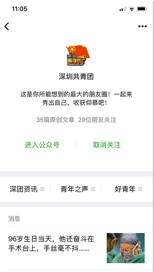 案例介紹:“深圳共青團(tuán)”微信公眾號(hào)于2013年開通,是全省最早開通的政務(wù)微信號(hào)。在近兩年加大力度建設(shè)和推廣后,粉絲數(shù)有了飛躍性的增長,推送閱讀量和影響力也有了比較明顯的提升。截至目前,累計(jì)推送1700余篇,平均閱讀量1萬以上,單篇最高閱讀量達(dá)到36萬,粉絲數(shù)90余萬。目前,公眾號(hào)影響力在全國地市級團(tuán)委中排名前3,在全市政務(wù)新媒體中排名前5。在發(fā)布的內(nèi)容上,主要關(guān)注時(shí)政要聞、社會(huì)熱點(diǎn)、政策解讀等與青年息息相關(guān)、喜聞樂見的話題內(nèi)容,弘揚(yáng)愛國精神和時(shí)代精神,是深圳共青團(tuán)聯(lián)系、引導(dǎo)和服務(wù)青年的重要載體。