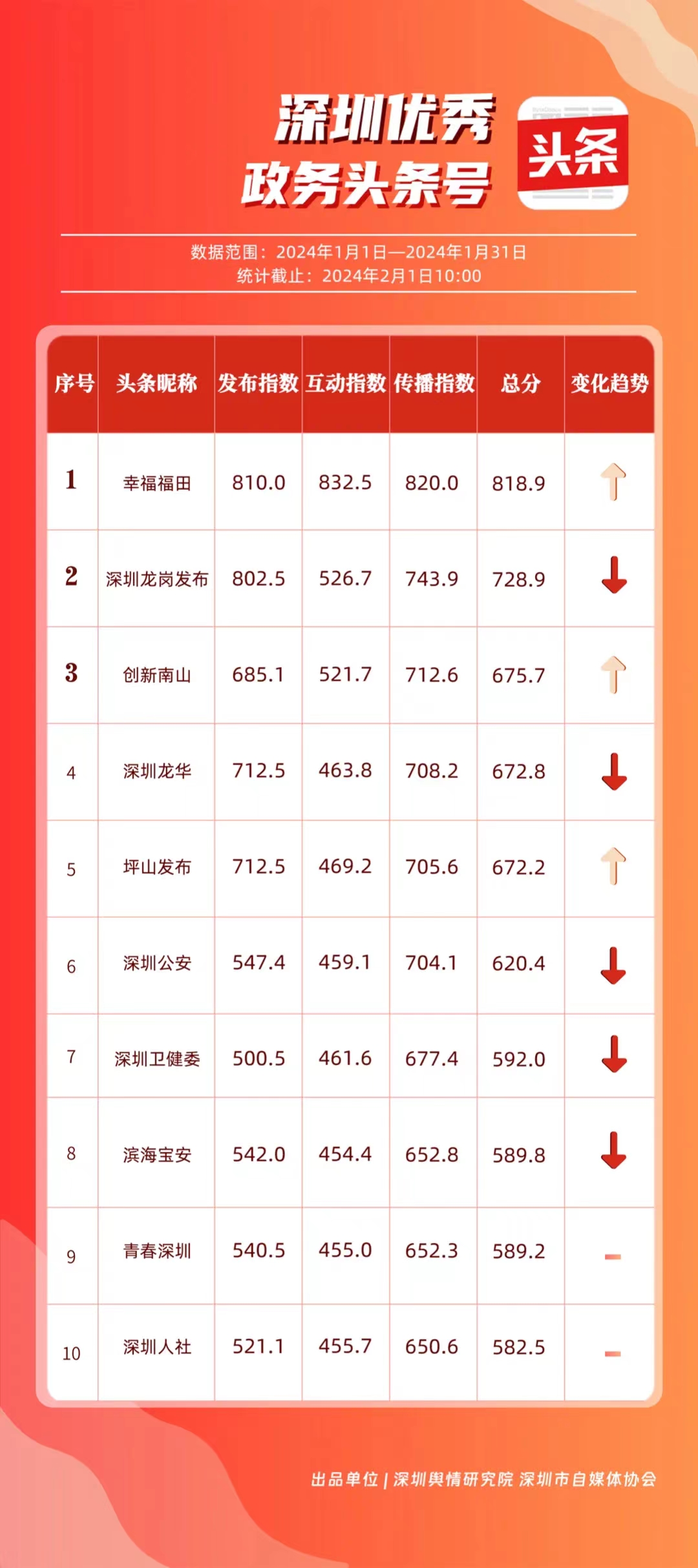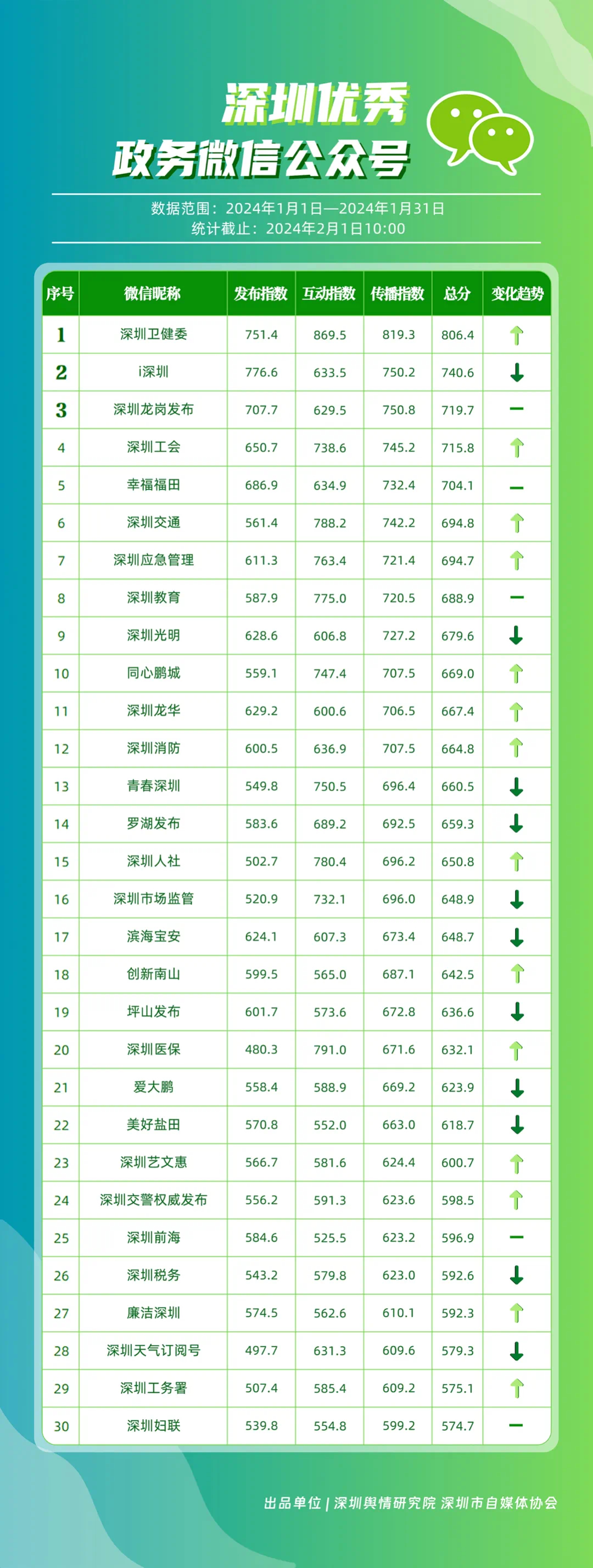深圳新聞網(wǎng)2月9日訊(記者 陳曉君 實習(xí)生 張馳)2月8日,深圳輿情研究院、深圳市自媒體協(xié)會聯(lián)合推出《深圳優(yōu)秀政務(wù)新媒體矩陣》(2024年1月期),市衛(wèi)生健康委、市氣象局、福田區(qū)、光明區(qū)、龍崗區(qū)、龍華區(qū)、市公安局、市應(yīng)急管理局、市交通警察局、羅湖區(qū)的新媒體矩陣獲評“深圳優(yōu)秀政務(wù)新媒體矩陣”。這些矩陣在內(nèi)容發(fā)布、受眾互動和信息傳播方面取得了較好成績,并在深圳政務(wù)新媒體規(guī)范有序發(fā)展進程中發(fā)揮著積極作用。