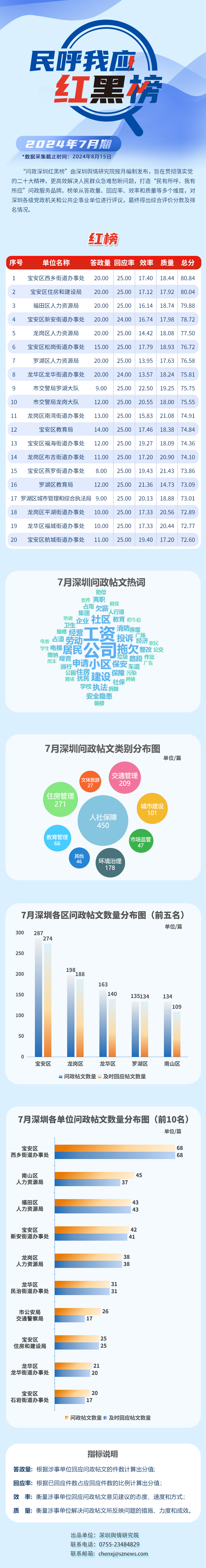 本期榜單采集的帖文主要來自深圳市及各區(qū)政府官網(wǎng)、深圳論壇、人民網(wǎng)領導留言板、深圳新聞網(wǎng)“民呼我應”等平臺,所采集帖文發(fā)布時間為2024年7月1日至7月31日,采集截止時間為2024年8月15日。