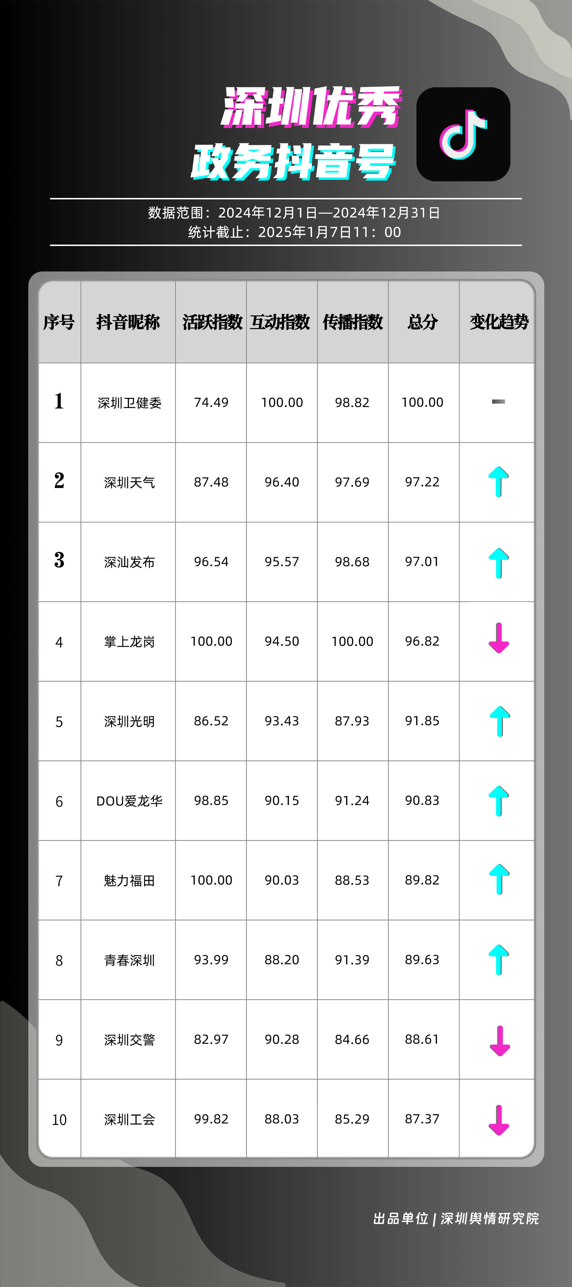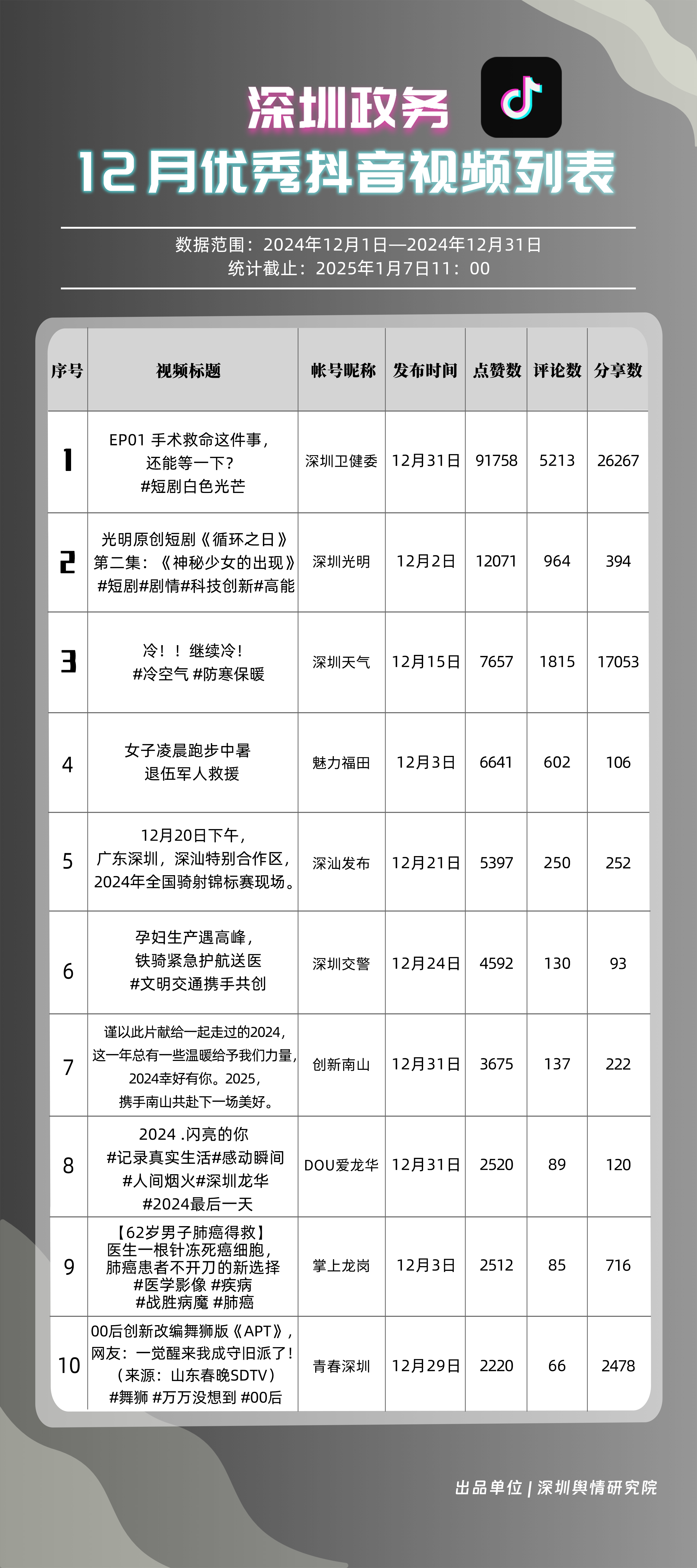 12月,“深圳衛(wèi)健委”“深圳天氣”“深汕發(fā)布”“掌上龍崗”“深圳光明”“DOU愛龍華”“魅力福田”“青春深圳”“深圳交警”“深圳工會”共10個政務(wù)抖音號獲得“深圳優(yōu)秀政務(wù)抖音號”稱號?!吧钲谛l(wèi)健委”在互動、傳播方面成績優(yōu)異,助推其位于榜單首位?!吧钲谔鞖狻薄吧钌前l(fā)布”“掌上龍崗”則各有所長,綜合排名位于榜單前列,內(nèi)容產(chǎn)出豐富、用戶互動高頻,信息傳播廣泛,共同展現(xiàn)了政務(wù)抖音號在服務(wù)公眾、提升信息傳播效能方面的顯著效能。