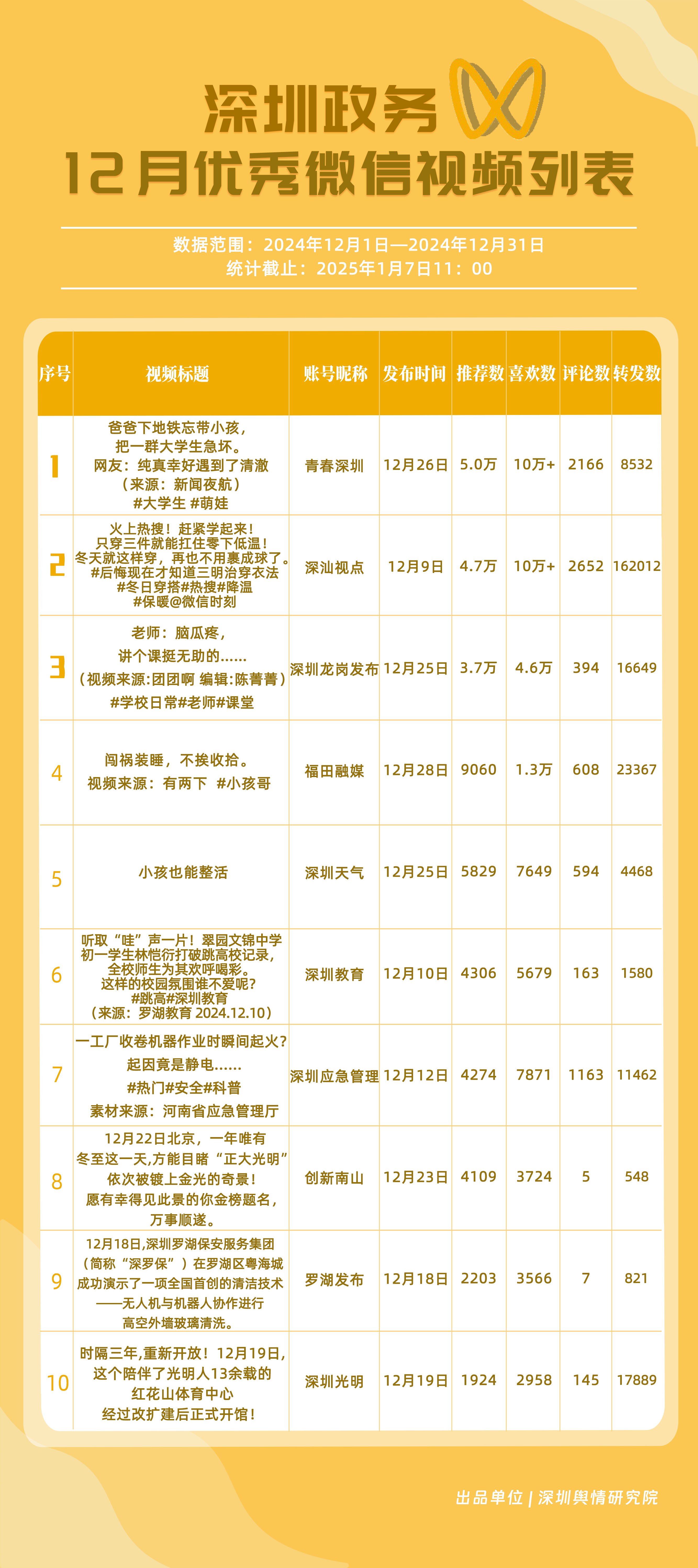 12月,獲“深圳優(yōu)秀政務(wù)微信視頻號”稱號的分別是“深汕視點”“青春深圳”“深圳龍崗發(fā)布”“福田融媒”“創(chuàng)新南山”“深圳天氣”“深圳光明”“深圳工會”“深圳應(yīng)急管理”“深圳教育”。其中,“深汕視點”“青春深圳”在互動方面表現(xiàn)突出,占據(jù)榜單第一、第二位置?!吧钲邶垗彴l(fā)布”活躍、互動指數(shù)位于各政務(wù)視頻號前列,排名有所提升。“福田融媒”三大指標(biāo)得分均在90分以上,位于榜單第四名,充分展現(xiàn)各政務(wù)微信視頻號在信息更新、用戶互動以及傳播范圍等方面的卓越能力和持續(xù)進步。