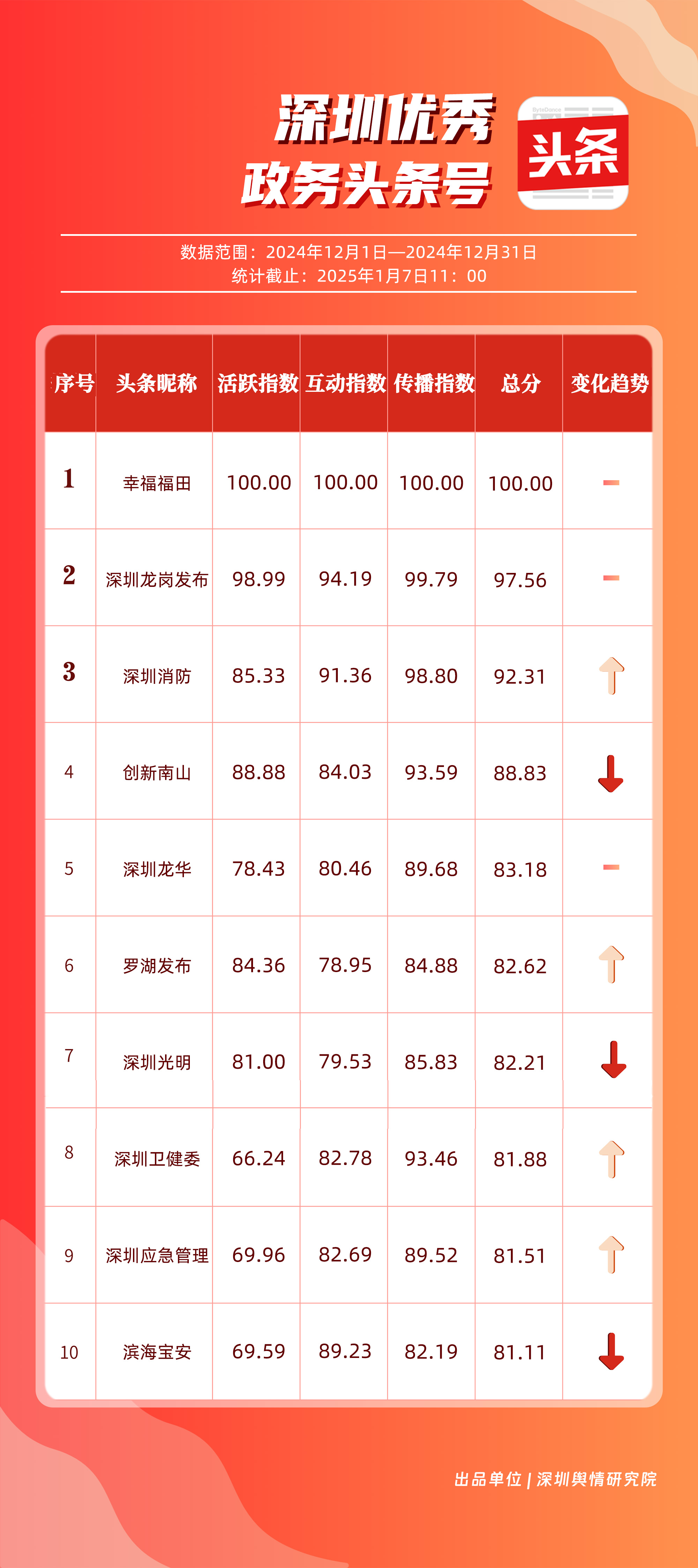 12月,“幸福福田”“深圳龍崗發(fā)布”“深圳消防”“創(chuàng)新南山”“深圳龍華”“羅湖發(fā)布”“深圳光明”“深圳衛(wèi)健委”“深圳應(yīng)急管理”“濱海寶安”共10個政務(wù)頭條號入選“優(yōu)秀政務(wù)頭條號”榜單。對比其他賬號,“幸福福田”在各方面均取得較好成績,居于榜單第一位置。“深圳龍崗發(fā)布”以97.56分位于榜單第二名,其傳播指數(shù)得分為99.79分,反映出賬號在信息傳播范圍方面存在明顯優(yōu)勢。此外,賬號“深圳消防”“創(chuàng)新南山”“深圳龍華”也為市民提供便捷、高效的政務(wù)信息,位于榜單前五名。