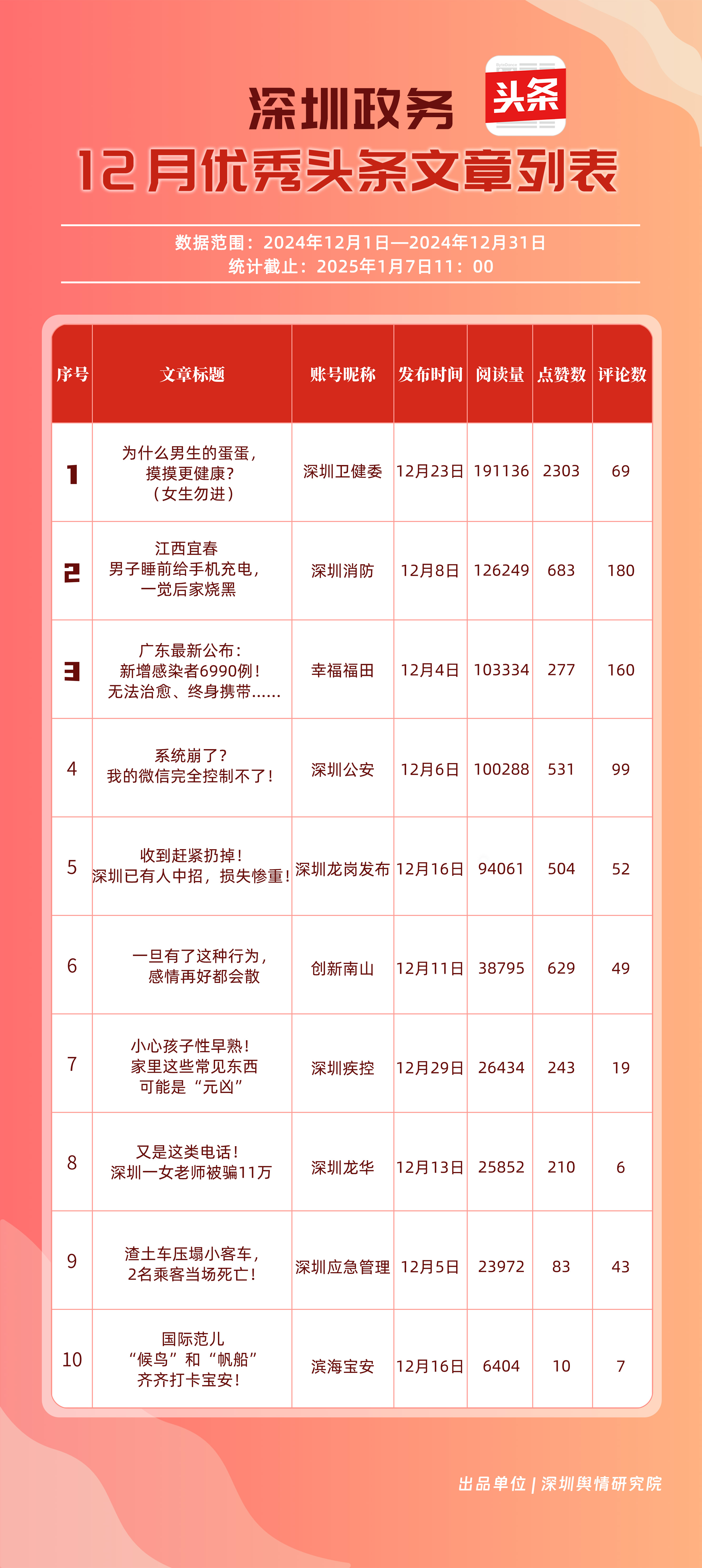 本期榜單數(shù)據(jù)收集自微信(含公眾號、視頻號)、微博、抖音、今日頭條,統(tǒng)計賬號數(shù)量為231個,統(tǒng)計數(shù)據(jù)時間范圍為2024年12月1日至12月31日,截止時間為2025年1月7日11:00。