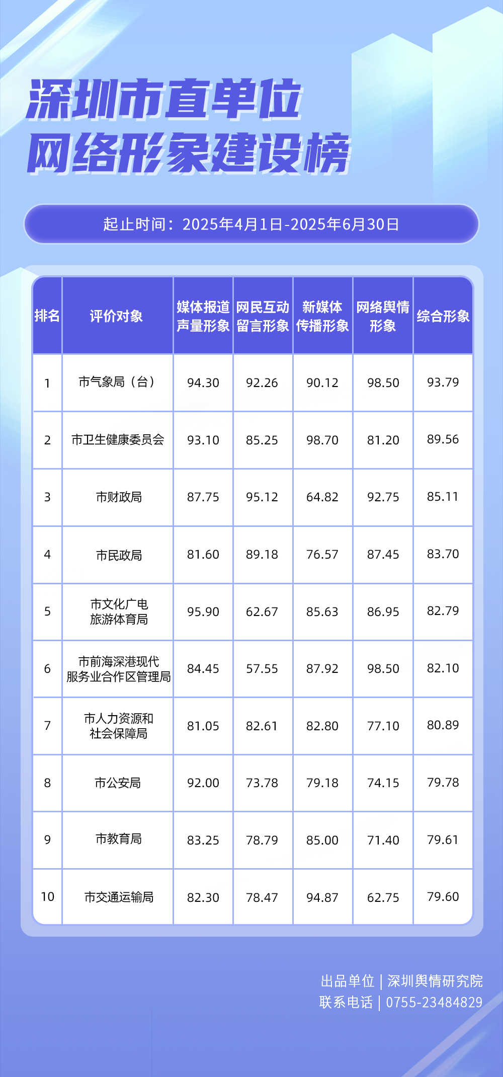 4-6月,市氣象局、市衛(wèi)生健康委員會、市財政局、市民政局、市文化廣電旅游體育局、市前海深港現(xiàn)代服務業(yè)合作區(qū)管理局、市人力資源和社會保障局、市公安局、市教育局、市交通運輸局在網絡形象建設工作方面表現(xiàn)相對突出,登上《深圳市直單位網絡形象建設榜》。其中,市氣象局、市衛(wèi)生健康委員會的網絡形象建設工作持續(xù)走在前列,其他上榜單位各展所長,在網絡宣傳、互動回應等方面積極作為,共同塑造深圳市直單位良好網絡形象。