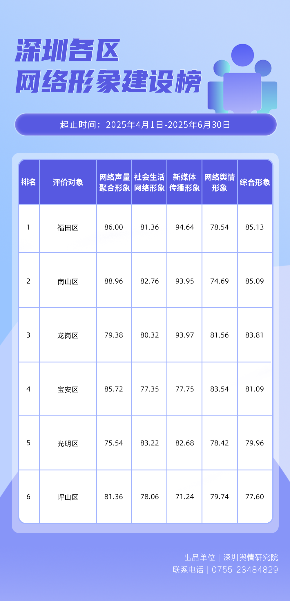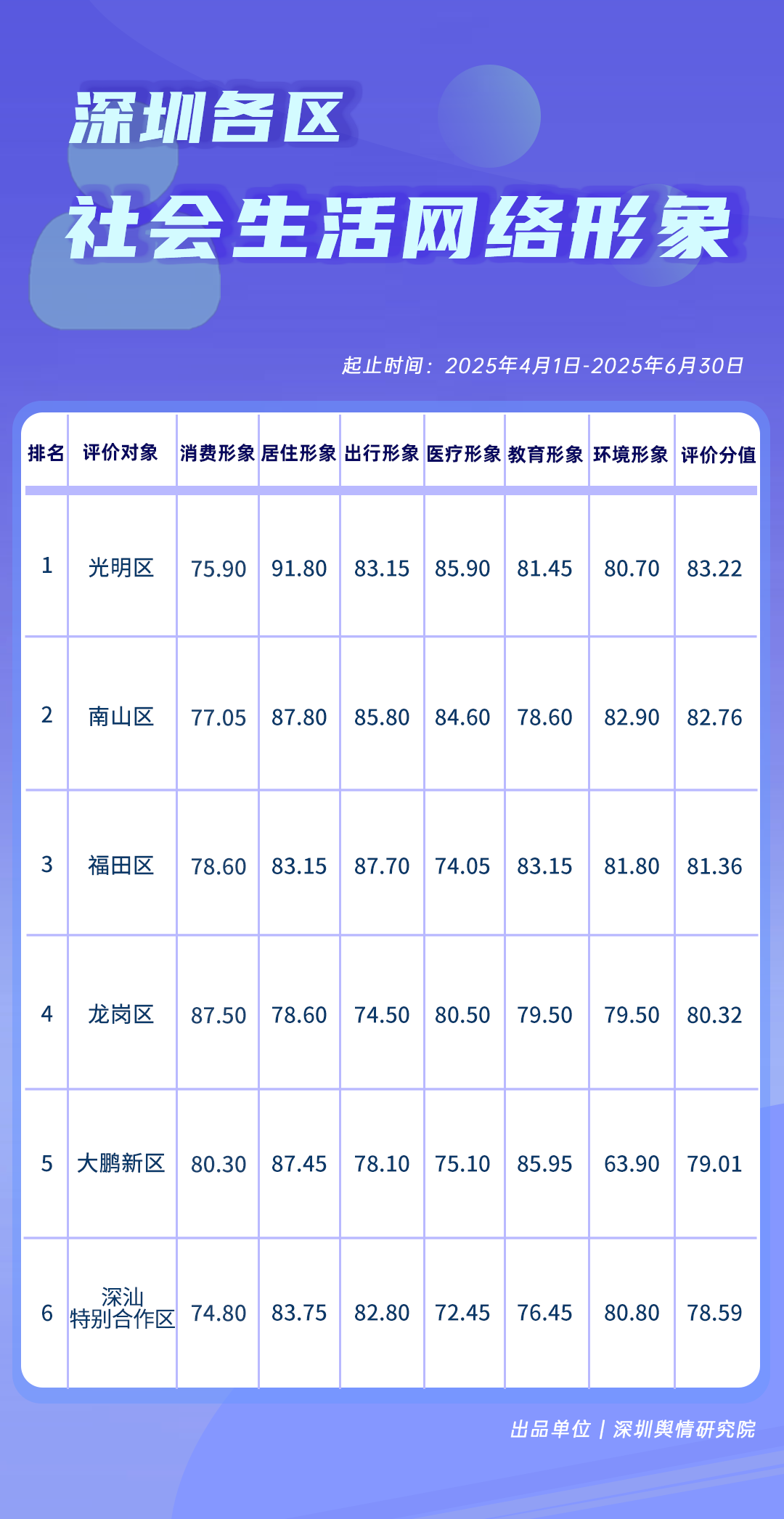 4-6月,《深圳各區(qū)社會生活網絡形象榜》中,光明區(qū)憑借在居住、醫(yī)療、出行等多方面的良好網絡呈現(xiàn),獲得較高綜合評價分值,南山區(qū)、福田區(qū)、龍崗區(qū)也表現(xiàn)優(yōu)異,四區(qū)綜合評價分值均超80分。大鵬新區(qū)、深汕特別合作區(qū)也在榜單中占據(jù)靠前位置,成為各區(qū)借助網絡力量增進民生福祉、推動協(xié)調發(fā)展的生動展現(xiàn)。
