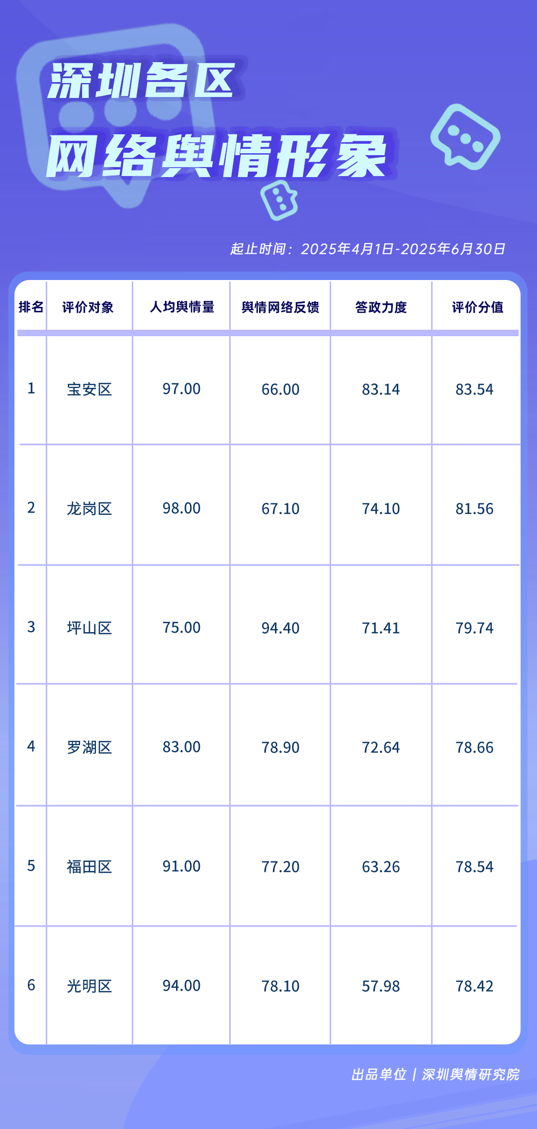 4-6月,在網絡輿情方面,寶安區(qū)、龍崗區(qū)憑借較低的人均輿情量、較好的答政效果,位居榜單前二;坪山區(qū)、羅湖區(qū)、福田區(qū)、光明區(qū)也躋身前列,以優(yōu)異分數(shù)展現(xiàn)其在網絡輿情工作中的積極成效,彰顯了各區(qū)在營造良好網絡輿情環(huán)境、及時回應網民訴求上的主動擔當。