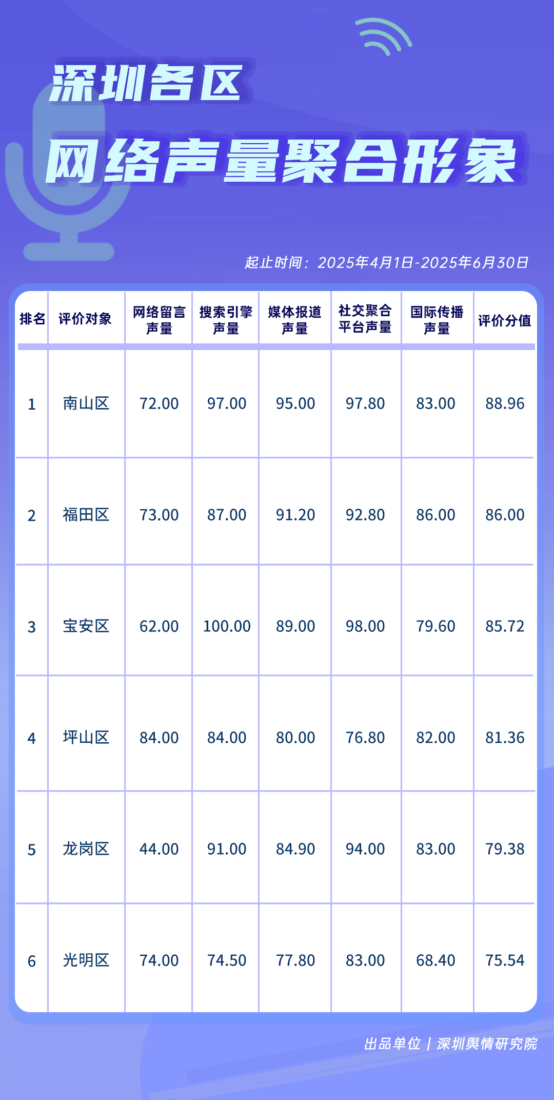 4-6月,《深圳各區(qū)網絡聲量聚合形象榜》中,南山區(qū)憑借各項聲量指標的優(yōu)異表現(xiàn),以88.96分榮登榜首,福田區(qū)、寶安區(qū)緊隨其后,在搜索引擎聲量、媒體報道聲量等指標上均斬獲高分,反映出市民及媒體對區(qū)域給予較高關注。坪山區(qū)、龍崗區(qū)、光明區(qū)也位居前列,表現(xiàn)不俗,為提升城市數(shù)字治理能級注入了源源不斷的動力。