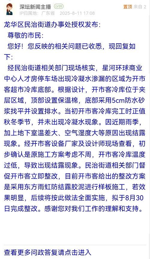 經(jīng)民治街道相關(guān)部門現(xiàn)場(chǎng)核實(shí),星河環(huán)球商業(yè)中心人才房停車場(chǎng)出現(xiàn)冷凝水滲漏的區(qū)域?yàn)殚_市客超市冷庫(kù)底部。根據(jù)設(shè)計(jì),開市客冷庫(kù)位于夾層區(qū)域,頂部設(shè)置保溫棉,底部采用5cm防水砂漿找平并設(shè)置排水。當(dāng)初開市客冷庫(kù)完工時(shí)正值秋冬季節(jié),并未出現(xiàn)冷凝水現(xiàn)象。因近期雨季,加上地下室溫差大、空氣濕度大等原因出現(xiàn)結(jié)露現(xiàn)象。經(jīng)開市客設(shè)備廠家及設(shè)計(jì)師現(xiàn)場(chǎng)查看,初步確認(rèn)是原施工方案考慮不周,開市客冷庫(kù)溫度過低,導(dǎo)致出現(xiàn)結(jié)露現(xiàn)象。民治街道相關(guān)部門督促開市客立即整改,目前開市客給出的整改方案是采用東方雨虹防結(jié)露膠泥進(jìn)行樣板施工,若效果明顯,后續(xù)將按此做法全面實(shí)施,擬于8月30日完成整改。感謝您對(duì)我們工作的理解和支持。