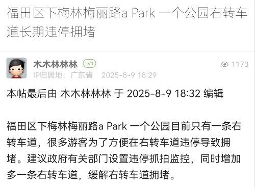 27. 帖文《福田區(qū)下梅林梅麗路a?Park?一個(gè)公園右轉(zhuǎn)車道長(zhǎng)期違停擁堵》