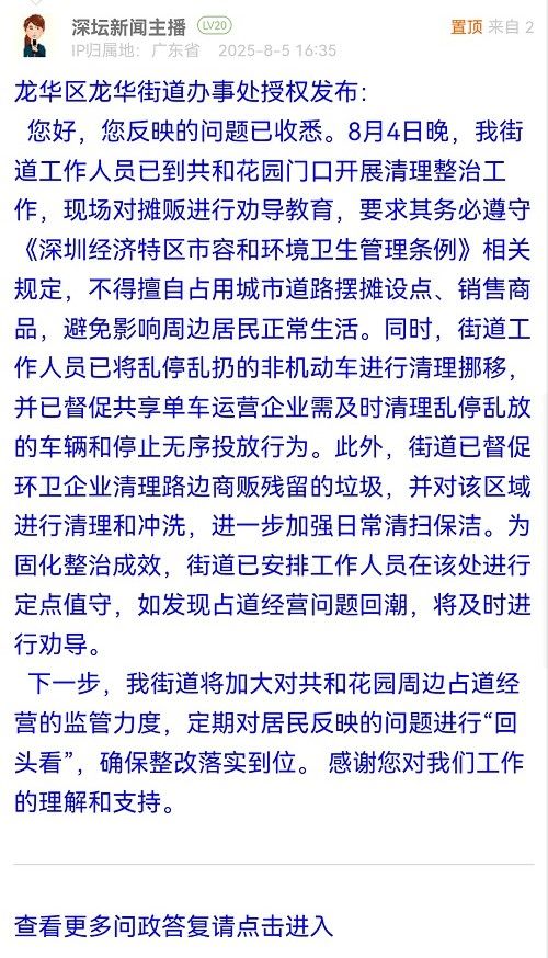 您好,您反映的問題已收悉。8月4日晚,我街道工作人員已到共和花園門口開展清理整治工作,現(xiàn)場(chǎng)對(duì)攤販進(jìn)行勸導(dǎo)教育,要求其務(wù)必遵守《深圳經(jīng)濟(jì)特區(qū)市容和環(huán)境衛(wèi)生管理?xiàng)l例》相關(guān)規(guī)定,不得擅自占用城市道路擺攤設(shè)點(diǎn)、銷售商品,避免影響周邊居民正常生活。同時(shí),街道工作人員已將亂停亂扔的非機(jī)動(dòng)車進(jìn)行清理挪移,并已督促共享單車運(yùn)營(yíng)企業(yè)需及時(shí)清理亂停亂放的車輛和停止無序投放行為。此外,街道已督促環(huán)衛(wèi)企業(yè)清理路邊商販殘留的垃圾,并對(duì)該區(qū)域進(jìn)行清理和沖洗,進(jìn)一步加強(qiáng)日常清掃保潔。為固化整治成效,街道已安排工作人員在該處進(jìn)行定點(diǎn)值守,如發(fā)現(xiàn)占道經(jīng)營(yíng)問題回潮,將及時(shí)進(jìn)行勸導(dǎo)。