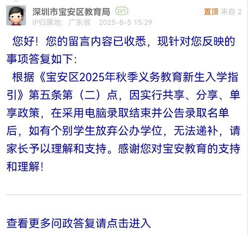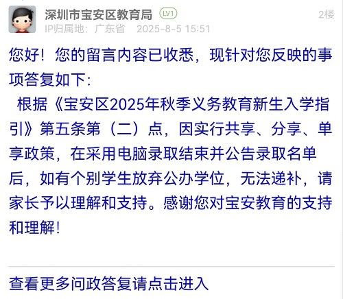 根據(jù)《寶安區(qū)2025年秋季義務(wù)教育新生入學(xué)指引》第五條第(二)點(diǎn),因?qū)嵭泄蚕?、分享、單享政策,在采用電腦錄取結(jié)束并公告錄取名單后,如有個(gè)別學(xué)生放棄公辦學(xué)位,無法遞補(bǔ),請(qǐng)家長(zhǎng)予以理解和支持。感謝您對(duì)寶安教育的支持和理解!