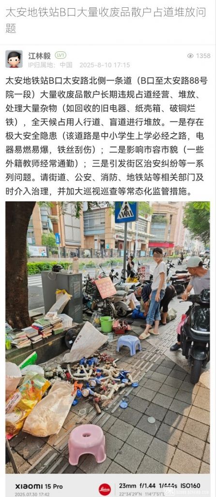 尊敬的市民:您好!您反映的問題我隊(duì)已收悉。收到情況后,我隊(duì)高度重視,第一時(shí)間安排工作人員前往現(xiàn)場(chǎng)核實(shí),相關(guān)處置情況如下:8月11日,我隊(duì)工作人員對(duì)太安地鐵站B口及周邊開展巡查,暫未發(fā)現(xiàn)占道回收廢品的人員。鑒于流動(dòng)收廢品人員無固定回收時(shí)間和攤位,我隊(duì)已安排工作人員在太安地鐵站B口周邊分時(shí)段值守,若發(fā)現(xiàn)相關(guān)占道經(jīng)營(yíng)人員,將立即予以勸離。對(duì)于不配合勸導(dǎo)的相關(guān)人員,將予以暫扣經(jīng)營(yíng)工具等措施。感謝您對(duì)城市管理工作的理解與支持!