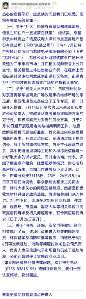 (二)關(guān)于“相關(guān)人員不作為”:自收到居民反對(duì)京基御景華城商業(yè)廣場(chǎng)改建手機(jī)維修市場(chǎng)的意見后,南園街道首先是成立了工作專班,第一時(shí)間介入處置。7月14日起多次約見京基公司和龍勝公司負(fù)責(zé)人,提醒其認(rèn)真考量商業(yè)規(guī)劃方案的可行性,積極探索更為妥善的商業(yè)方案,并于7月16日起開展現(xiàn)場(chǎng)走訪與檔案調(diào)閱工作,為后續(xù)解答居民問題做好準(zhǔn)備。其次是定向收集居民和商戶訴求,開展走訪座談。專班通過線下見面訪談、線上添加微信等方式,與業(yè)主代表建立聯(lián)系,其中街道掛點(diǎn)領(lǐng)導(dǎo)主動(dòng)加入樓棟微信群進(jìn)一步聽取大家的訴求意見。同時(shí)走訪商戶代表,詳細(xì)了解各商戶租約、經(jīng)營(yíng)現(xiàn)狀等情況,耐心聽取商戶核心訴求,告知工作進(jìn)展及下步計(jì)劃。此外,街道分別于7月18日、23日、26日及8月4日召開居民協(xié)調(diào)會(huì)、群眾接訪會(huì)和業(yè)主見面會(huì)等,針對(duì)大家關(guān)心的問題答疑解惑。然后是積極收集材料并研究政策法規(guī),協(xié)調(diào)相關(guān)部門深入探討。7月中下旬,街道多次組織區(qū)商務(wù)局、住建局、規(guī)自局、市監(jiān)局、消防大隊(duì)等相關(guān)單位共同研究居民訴求及相關(guān)問題清單,聯(lián)合回應(yīng)居民訴求(已于7月26日召開)。