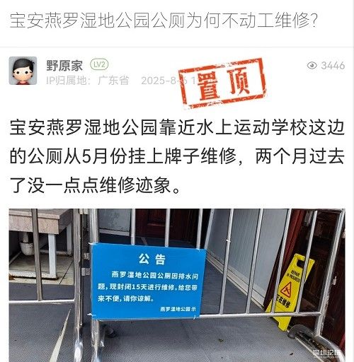 11. 帖文《寶安燕羅濕地公園公廁為何不動(dòng)工維修?》
