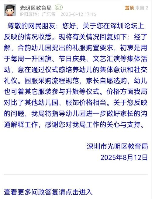 尊敬的網(wǎng)民朋友:您好,關(guān)于您在深圳論壇上反映的情況收悉?,F(xiàn)將有關(guān)情況回復(fù)如下:經(jīng)了解,合韻幼兒園提出的禮服購(gòu)置要求,初衷是用于每周一升國(guó)旗、節(jié)日慶典、文藝匯演等集體活動(dòng),意在通過儀式感培養(yǎng)幼兒的集體意識(shí)和社交禮儀。園服采購(gòu)流程規(guī)范,家長(zhǎng)自愿選購(gòu),幼兒也可著其它服裝參與升旗等儀式。價(jià)格方面我局對(duì)比了其他幼兒園,服飾價(jià)格相當(dāng)。關(guān)于您反映的問題,我局將指導(dǎo)幼兒園進(jìn)一步做好家長(zhǎng)的溝通解釋工作,感謝您對(duì)我局工作的關(guān)心與支持。