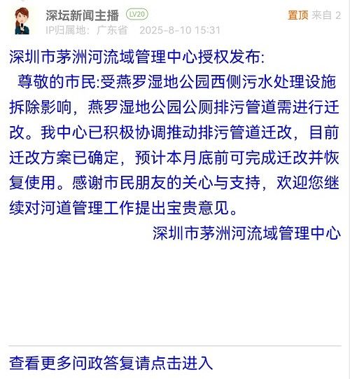尊敬的市民:受燕羅濕地公園西側(cè)污水處理設(shè)施拆除影響,燕羅濕地公園公廁排污管道需進(jìn)行遷改。我中心已積極協(xié)調(diào)推動(dòng)排污管道遷改,目前遷改方案已確定,預(yù)計(jì)本月底前可完成遷改并恢復(fù)使用。感謝市民朋友的關(guān)心與支持,歡迎您繼續(xù)對(duì)河道管理工作提出寶貴意見。