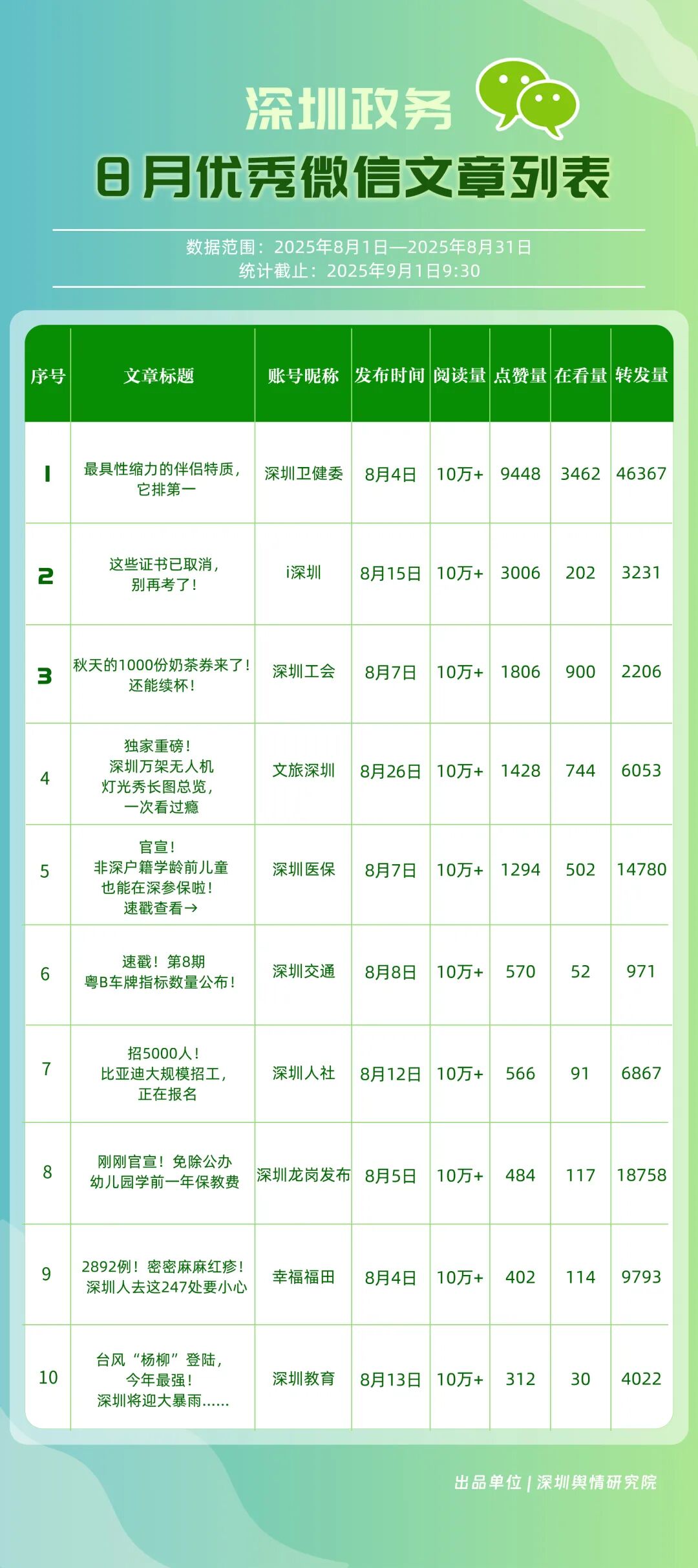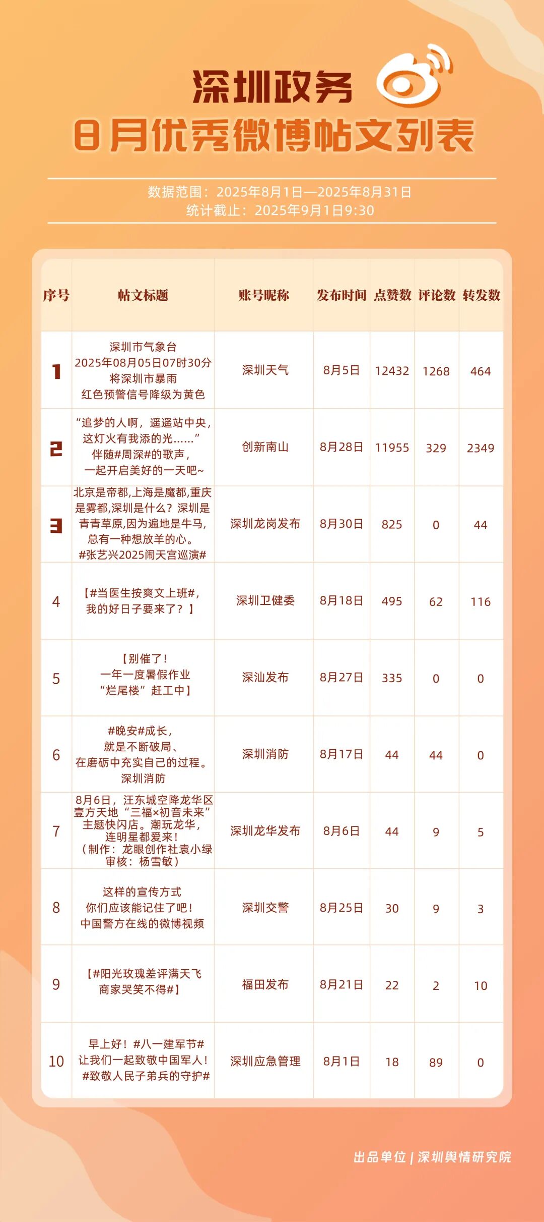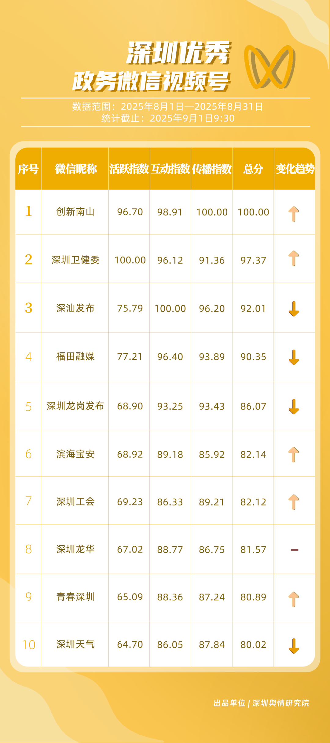 8月,“深圳幸福福田”“深圳消防”“深圳衛(wèi)健委”“創(chuàng)新南山”“深圳人社”“羅湖發(fā)布”“深圳龍崗發(fā)布”“深圳龍華”“青春深圳”“坪山發(fā)布”共10個政務(wù)頭條號入選“優(yōu)秀政務(wù)頭條號”榜單?!吧钲谛腋8L铩睉{借持續(xù)優(yōu)異的綜合表現(xiàn),以滿分成績穩(wěn)居榜單首位,彰顯出強大的政務(wù)傳播力與影響力;“深圳消防”“深圳衛(wèi)健委”則以穩(wěn)定的內(nèi)容質(zhì)量與深厚的民眾基礎(chǔ),持續(xù)為市民提供權(quán)威、及時的服務(wù)信息,排名穩(wěn)固?!皠?chuàng)新南山”“深圳人社”等上榜賬號亦表現(xiàn)亮眼,聚焦民生服務(wù)傳遞政策溫度,共同構(gòu)成政務(wù)新媒體矩陣的中堅力量,為城市治理與民生服務(wù)注入鮮活動能。