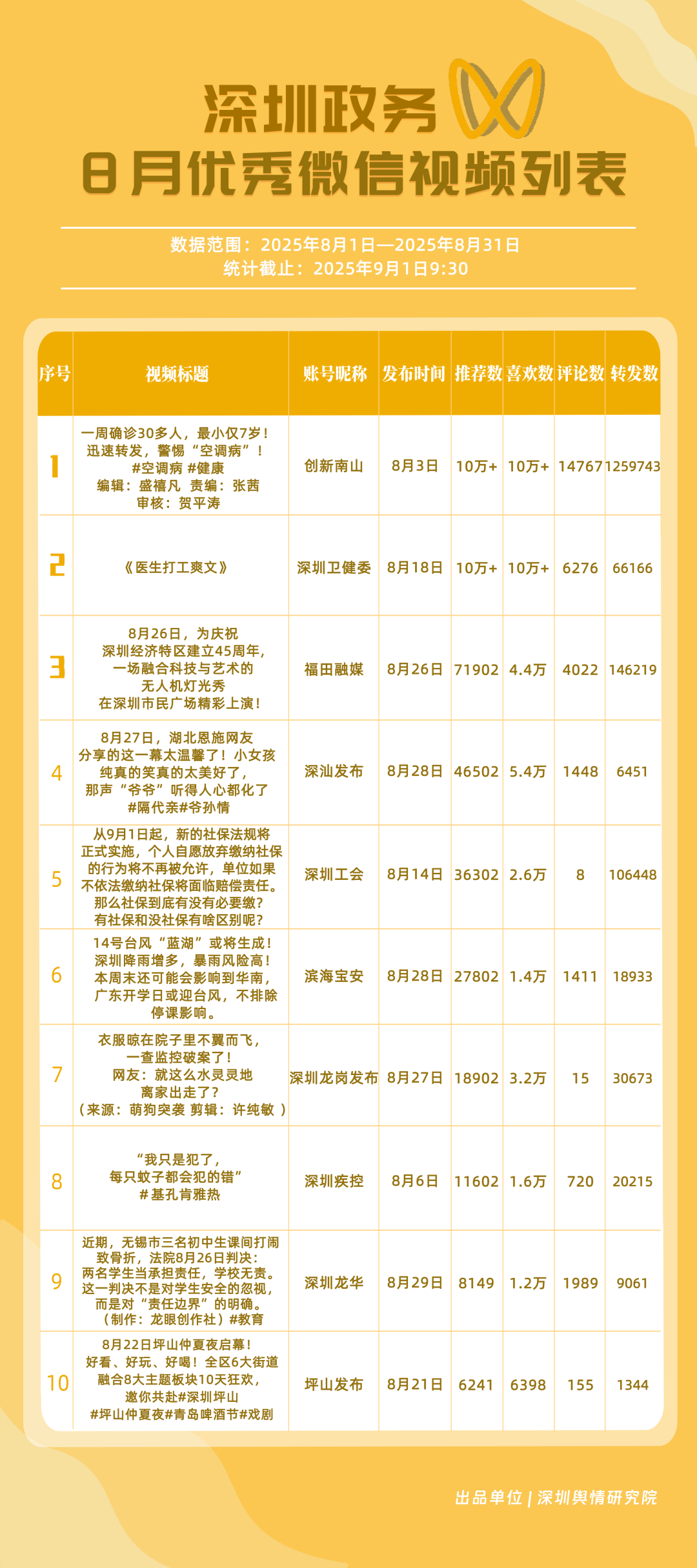 8月,“深圳衛(wèi)健委”“深汕發(fā)布”“深圳魅力福田”“深圳天氣”“掌上龍崗”“DOU愛龍華”“創(chuàng)新南山”“深圳普法”“文旅深圳”“美好鹽田”共10個政務(wù)抖音號獲得“優(yōu)秀政務(wù)抖音號”稱號?!吧钲谛l(wèi)健委”內(nèi)容吸引大量網(wǎng)民關(guān)注,4條視頻累計獲得超50萬次點贊,排名從上期的第九名上升至第一名;“深汕發(fā)布”憑借較高的傳播指數(shù)評分,位列第二名,排名有所上升?!吧钲邝攘ΩL铩薄吧钲谔鞖狻钡荣~號緊隨其后,得分均在95分左右。上榜的優(yōu)秀政務(wù)抖音號深耕優(yōu)質(zhì)創(chuàng)作,精準把握網(wǎng)民興趣點,使作品收獲高點贊、高轉(zhuǎn)發(fā),推動評論區(qū)形成良性互動氛圍,以優(yōu)秀內(nèi)容提升政務(wù)傳播效能。