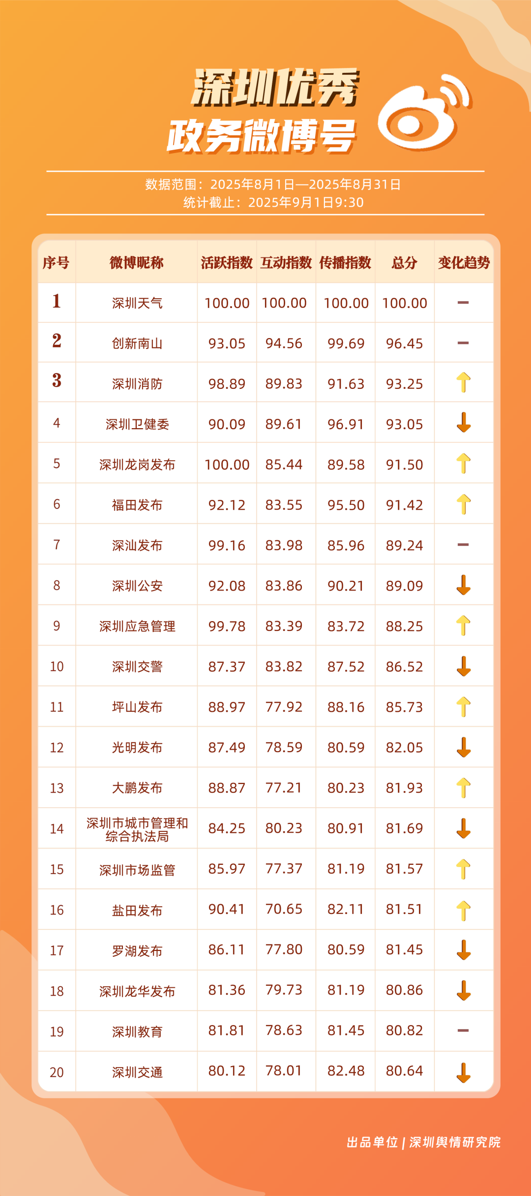 8月,“深圳天氣”“創(chuàng)新南山”“深圳消防”“深圳衛(wèi)健委”“深圳龍崗發(fā)布”“福田發(fā)布”“深汕發(fā)布”“深圳公安”“深圳應(yīng)急管理”“深圳交警”等20個賬號入選“優(yōu)秀政務(wù)微博號”。其中,“深圳天氣”持續(xù)以優(yōu)質(zhì)內(nèi)容受到網(wǎng)民肯定,蟬聯(lián)榜首;“創(chuàng)新南山”傳播指數(shù)得分再提升,總分96.45,排名保持在第二位;“深圳消防”積極發(fā)布消防相關(guān)內(nèi)容,以93.25分位列第三。上榜優(yōu)秀政務(wù)微博賬號精準把握網(wǎng)民興趣點,內(nèi)容獨具風(fēng)采,收獲網(wǎng)民認可,實現(xiàn)了較好的傳播效果。