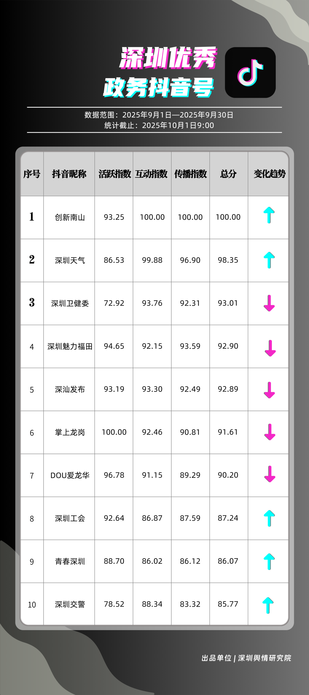 9月,深圳政務新媒體矩陣持續(xù)優(yōu)化內容生態(tài),各單位依托平臺特色深化服務效能,南山區(qū)、市衛(wèi)生健康委員會、市氣象局(臺)、龍崗區(qū)、福田區(qū)、龍華區(qū)、深汕特別合作區(qū)、市應急管理局、中國共產(chǎn)主義青年團深圳市委員會、光明區(qū)的新媒體矩陣入選“深圳優(yōu)秀政務新媒體矩陣”榜單。9月,南山區(qū)在短視頻平臺表現(xiàn)突出,抖音、微信視頻號平臺均獲滿分;市衛(wèi)生健康委員會輸出深度內容,位列榜單第二;市氣象局(臺)新媒體矩陣居于榜單第三,在9月發(fā)布臺風相關天氣提醒,獲得公眾廣泛關注。此外,龍崗區(qū)、福田區(qū)、龍華區(qū)、深汕特別合作區(qū)新媒體矩陣持續(xù)推出優(yōu)質內容,共同展現(xiàn)了深圳在塑造現(xiàn)代化形象、提升數(shù)字治理能力上的創(chuàng)新引領作用。