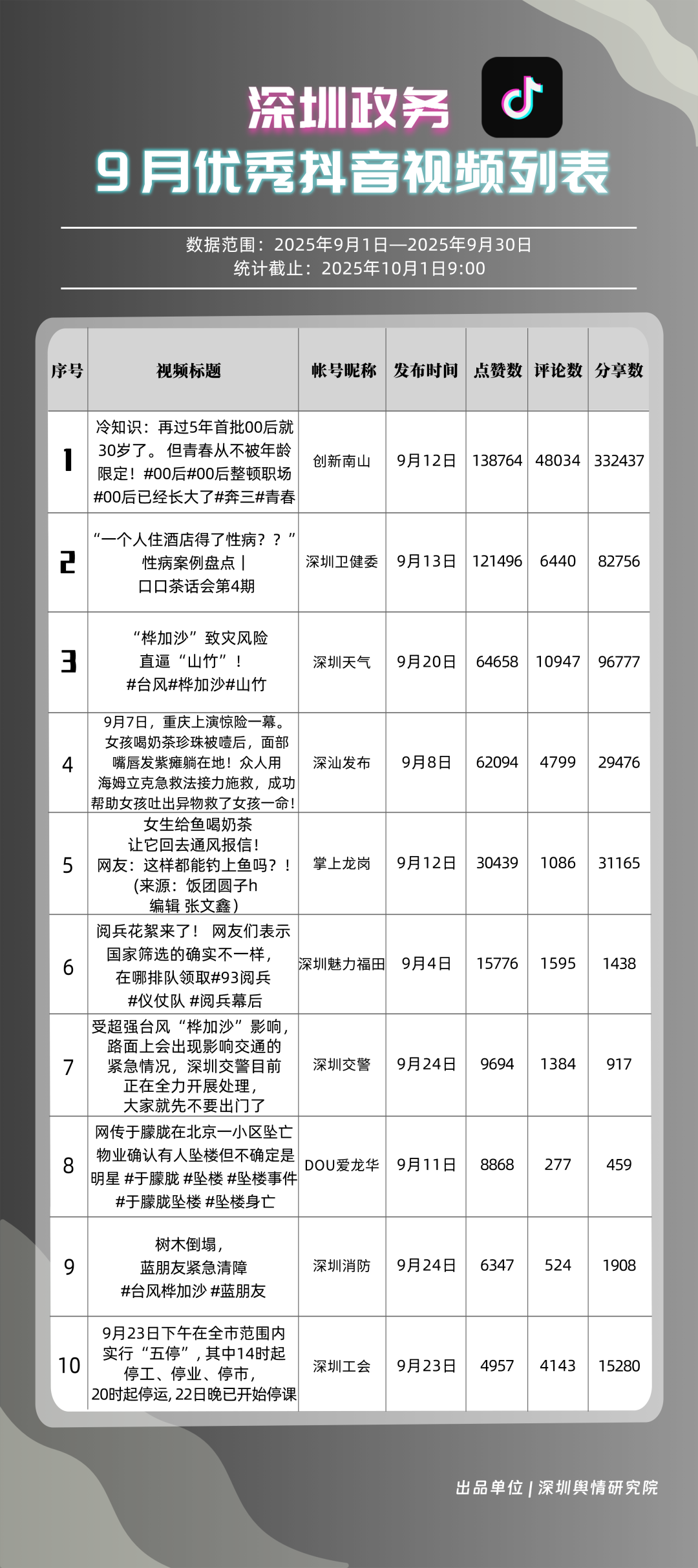 9月,獲得“優(yōu)秀政務抖音號”稱號的是“創(chuàng)新南山”“深圳天氣”“深圳衛(wèi)健委”“深圳魅力福田”“深汕發(fā)布”“掌上龍崗”“DOU愛龍華”“深圳工會”“青春深圳”“深圳交警”。“創(chuàng)新南山”以一條有關“青春不被年齡限定”的視頻獲得超34萬次轉發(fā),超14萬次點贊,助力其在抖音榜單居于榜首;“深圳天氣”多條臺風相關視頻吸引大量網(wǎng)民關注、互動,在抖音平臺得分超98分;“深圳衛(wèi)健委”“深圳魅力福田”“深汕發(fā)布”等賬號緊隨其后,得分均在92分以上。上榜的優(yōu)秀政務抖音號以“有溫度”的敘事表達,將宣傳、服務內容轉化為網(wǎng)民喜聞樂見的視頻,收獲高點贊、高轉發(fā)的流量實績,更在評論區(qū)形成了良性互動生態(tài),深度運營收獲了較好成果。