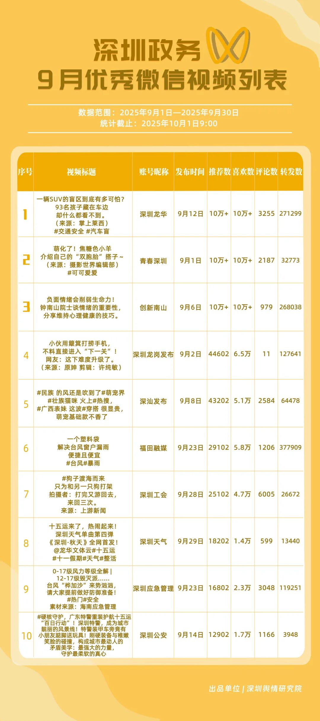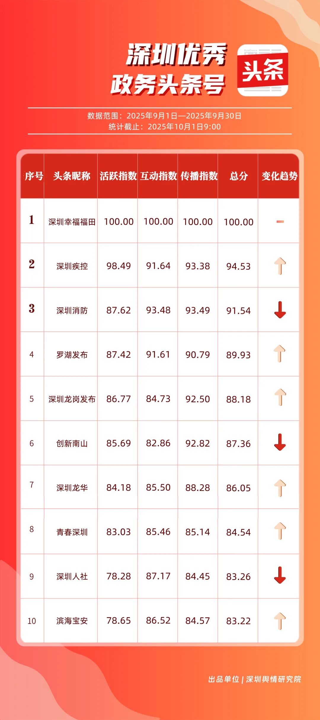 9月,“深圳衛(wèi)健委”“深圳龍崗發(fā)布”“幸福福田”“i深圳”“青春深圳”“深圳工會”“深圳教育”“深圳交通”“創(chuàng)新南山”“深圳應急管理”等30個政務微信公眾號榮登“深圳優(yōu)秀政務微信公眾號”榜單。9月,“深圳衛(wèi)健委”以總分100.00的成績蟬聯(lián)榜單首位,其憑借突破常規(guī)視角的選題,解讀專業(yè)健康知識,引發(fā)大量網(wǎng)民共鳴,內容質量與傳播力形成雙向賦能;“深圳龍崗發(fā)布”以總分93.24位居第二,聚焦區(qū)域民生服務升級等動態(tài),信息觸達率不斷提升;“幸福福田”圍繞商圈經(jīng)濟復蘇、文化節(jié)慶活動等主題開展系列宣傳,增強區(qū)域活力展示,位列第三;“i深圳”“青春深圳”“深圳工會”等也持續(xù)優(yōu)化賬號內容,通過實用信息推送強化政務服務定位。